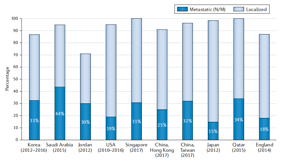 筛查的影响——欧洲前列腺癌筛查随机研究(ERSPC)的16年随访显示,前列腺癌筛查降低了20%的死亡率,且过度筛查的危害随着随访时间的延长而减少。在总体发病率较低的亚洲进行筛查的成本和效益仍不得而知。目前,日本是唯一一个在普通人群中倡导PSA筛查的亚洲国家。得益于广泛的PSA筛查,日本总体及老年人的前列腺癌发病率和死亡率AACR与英美国家一样有所降低(图1,2),且转移性疾病的比例更低;而有相同人口背景的中国,转移性疾病的比例是其两倍(图3)。
