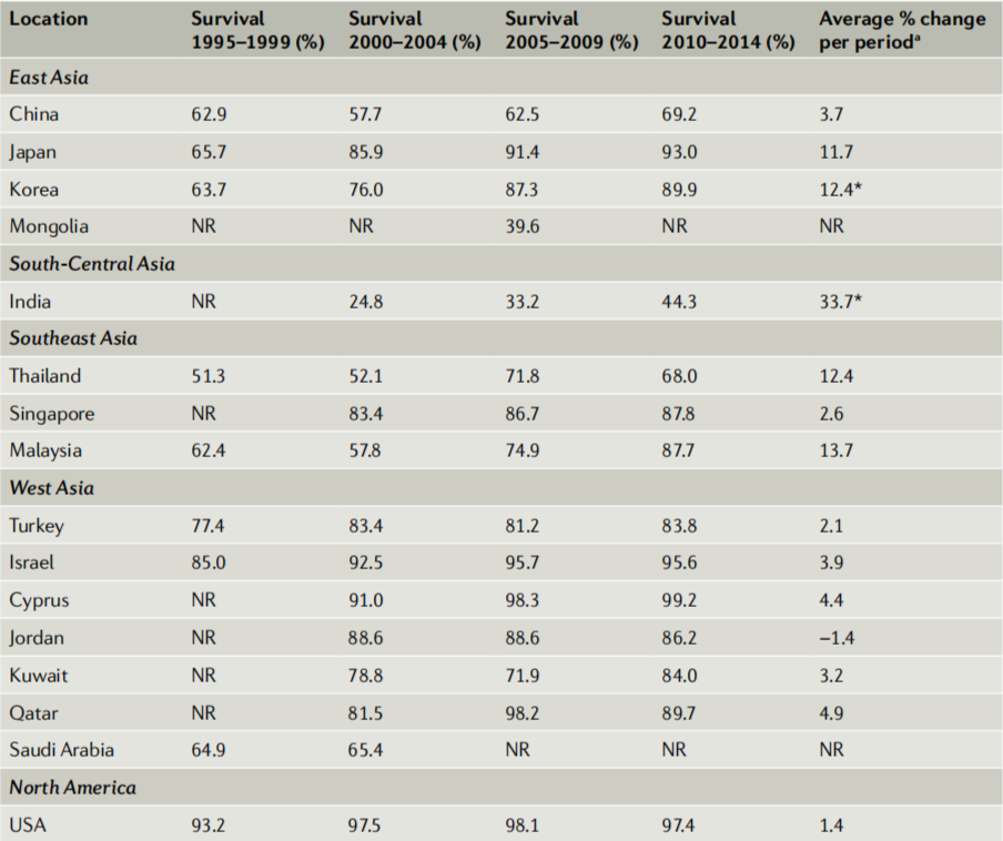 表2. 部分亚洲国家及美国的前列腺癌5年生存率变化