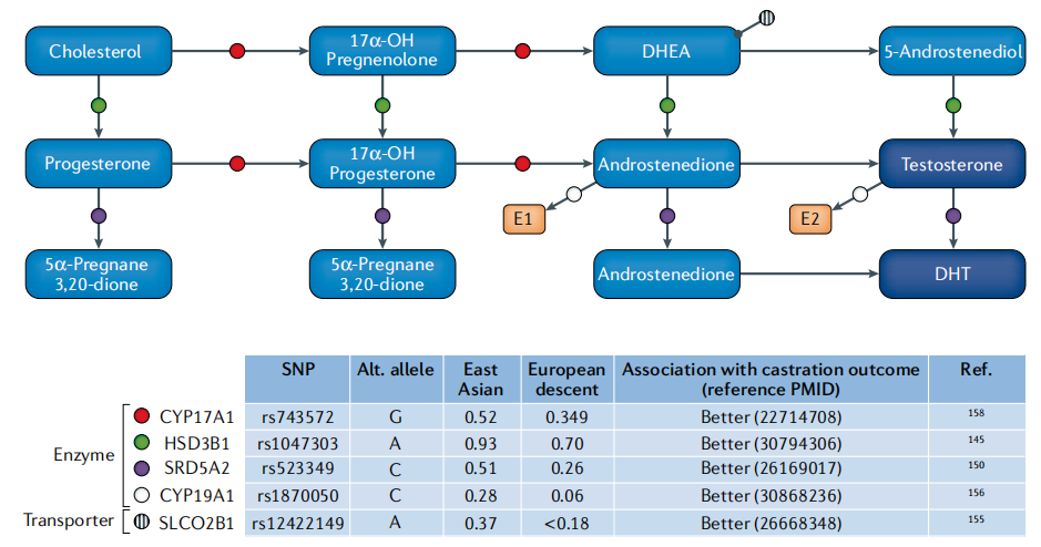 药物基因组学和睾酮——有研究提示,雄激素剥夺治疗(ADT)在亚洲人群中的疗效好于北美人群。控制雄激素合成、分布和运输,并调节ADT作用关键基因有HSD3B1、SRD5A2、SLCO2B1、CYP19A1和CYP17A1等(图4)。其中,HSD3B1可调节肾上腺前体转化为雄激素,其1245A>C等位基因变异与前列腺癌去势抵抗性等不良预后相关;而东亚人群中的C等位基因突变率仅为欧洲人群的四分之一(0.07 vs 0.30),这个可能部分解释亚洲人群的ADT疗效相对更好。