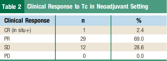 最终对42例患者进行了化疗反应评估(患者特征见表1),42位患者的中位年龄为47岁(范围:34-70岁)。其中16例(38.1%)临床分期为IIA,22例(52.4%)为IIB,4例(9.5%)为III期。42例患者中33例(78.6%)在NAC前为淋巴结阳性。4名患者患有双侧乳腺癌。所有患者均完成了4个周期的TC,绝经前患者术后接受他莫昔芬治疗,绝经后患者接受芳香化酶抑制剂治疗。
