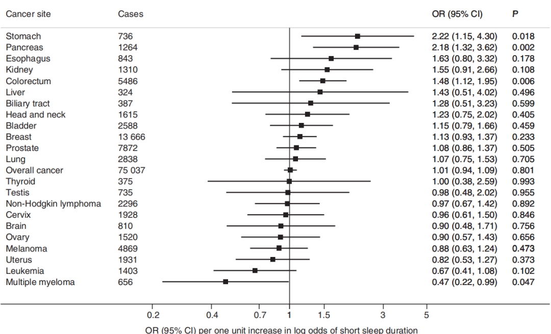 图1.短睡眠时间的遗传倾向与整体癌症和22种部位特异性癌症的关系