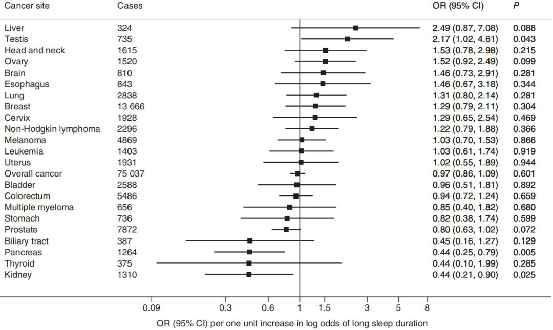 图2.长睡眠时间的遗传倾向与整体癌症和22种部位特异性癌症的关系