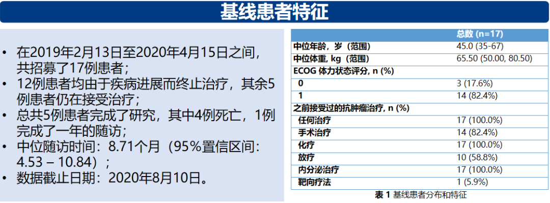 研究结果:截止至2020年8月10日,一共有17例患者参加了1a期临床研究。其中,曾接受内分泌治疗和化疗的患者分别为16例(94.1%)和13例(76.5%)。450 mg剂量组中的两例患者发生了DLT事件,分别为4级血小板减少症和4级中性粒细胞减少症,在其他剂量水平上均未观察到DLT。出现次数最多的是血液学TEAE:白细胞减少症(16/17,94.1%),中性粒细胞减少症(15/17,88.2%),贫血(11/17,64.7%)和血小板减少症(8/17,47.1%)。主要3-4级TEAE为中性粒细胞减少症和白细胞减少症,分别发生于11例(64.7%)和8例(47.1%)例患者中。