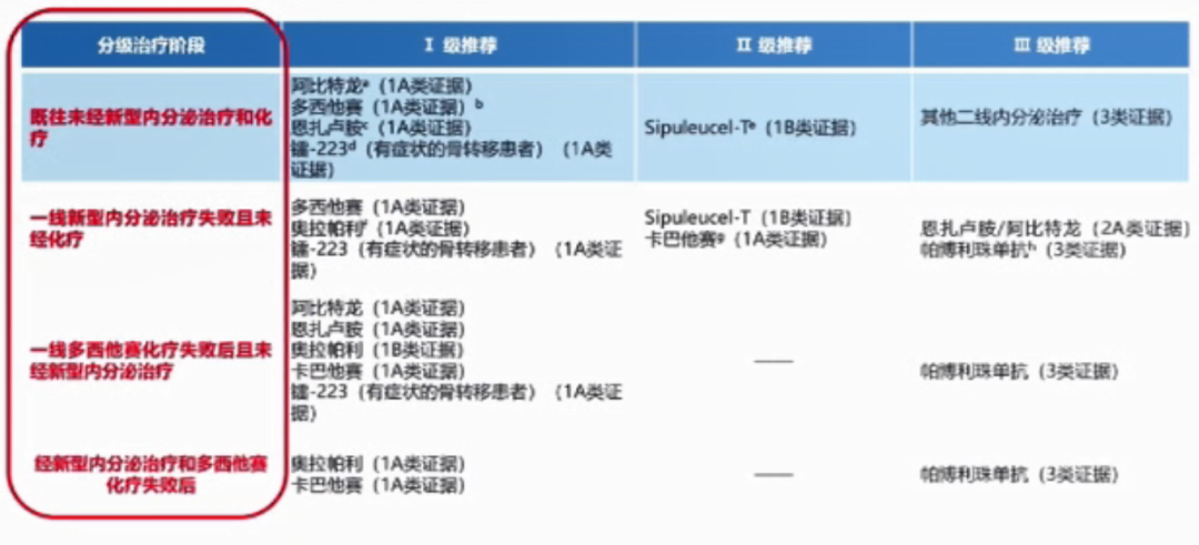 基于2021 V2 NCCN指南的修改,新版CSCO PC指南将对转移性去势抵抗性前列腺癌的诊疗章节的表格进行重绘,由于mCRPC阶段治疗方案繁杂,之前的“一线、二线、三线”的描述方式不能描述清楚各类方案之间的序贯关系,所以采用既往是否接受过新型内分泌治疗/化疗取代传统的一线、二线描述的分类方法,更加清晰直观地指导不同阶段mCRPC患者的治疗。