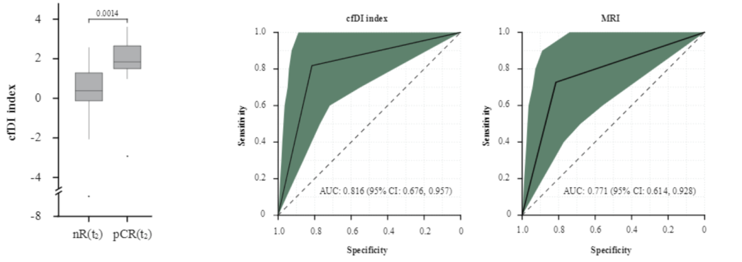 【结论与思考】尽管已经有广泛报道证明cfDII在早期或进展期乳腺癌诊断中的应用和重要性,但检测这些生物标记物在接受新辅助患者中的疗效预测和预后价值的研究甚少。该研究首次证明了测量患者新辅助化疗后术前cfDII辅助预测达到pCR人群的巨大潜力。将cfDII与MRI结合用于前瞻性研究可行性大、令人期待。此项研究的局限性在于样本量小,未来需要设计进行大样本量的随机对照研究。
