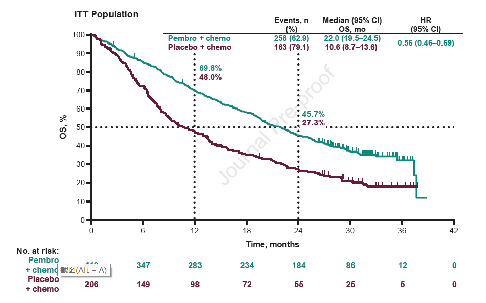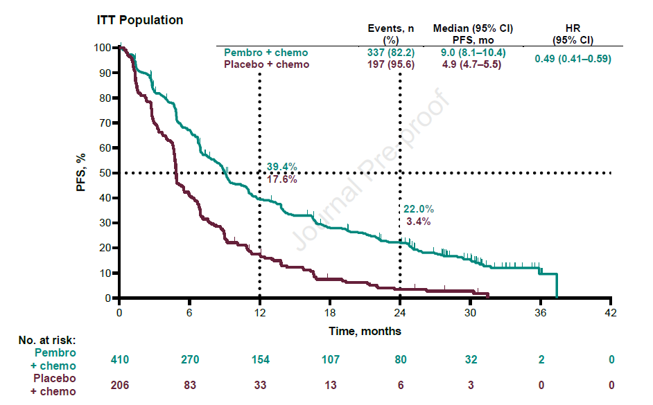 该研究共在118家研究中心纳入616例患者,联合免疫治疗组和单纯化疗组分别入组410例和206例患者,患者基线特点均衡可比。数据锁库时,全组患者中位随访时间31个月,两组分别有17例和1例患者继续接受研究药物治疗。中位治疗持续时间分别为7.2个月和4.2个月,13.7%的患者完成35周期治疗。化疗组有40.8%的患者疾病进展后交叉接受Pembrolizumab治疗,另有15%的患者接受其他针对PD-1或PD-L1的免疫检查点抑制剂治疗。
