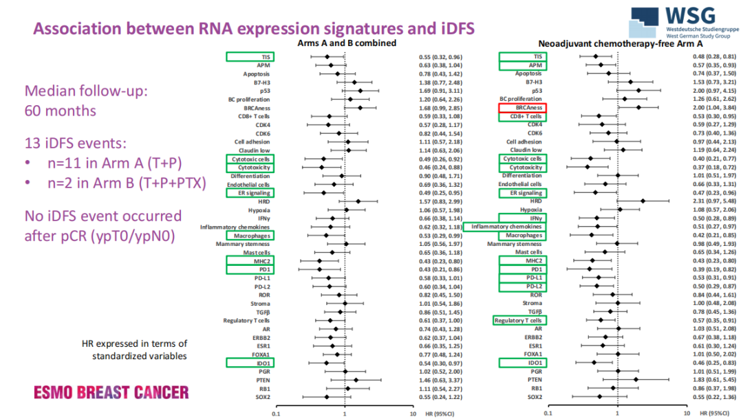 该研究入组了包括cT1-cT4c,cN0-3 HER2+/HR-早期乳腺癌患者,随机分为接受帕妥珠单抗(P)联合曲妥珠(T)(P+T组;n=92)或P+T+紫杉醇组(n=42)。使用NanoString Breast Cancer 360面板(n=117)分析基线(BL)活检中的基因表达特征;分别有119例患者和76例患者的BL和治疗后(第3周)sTIL水平可用。标准化基因表达特征对pCR(odds ratio,OR)和侵袭性无病生存(iDFS)的影响分别用logistic回归和Cox回归估计风险比(HR);并计算了Spearman相关性。