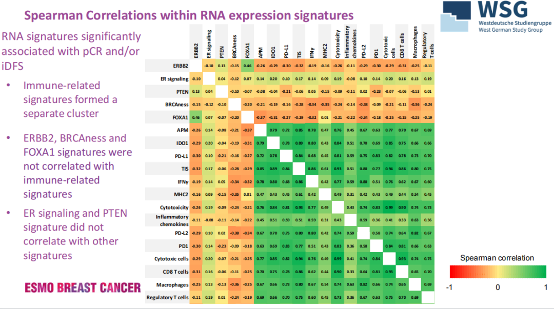 本次ESMO大会公布的转化研究的特色在于将肿瘤看成一个整体,不但对绝大部分入组患者的基因特征做了360基因的panel分析,同时也对其周围的免疫微环境做了相关分析,找到了与pCR及长期生存相关的基因表达特征。
