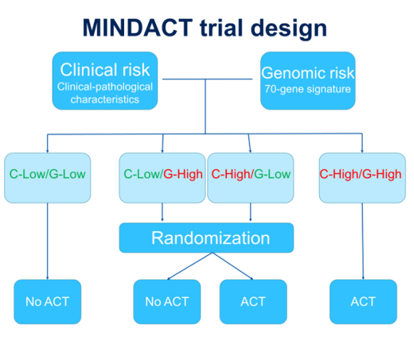 前瞻性Ⅲ期MINDACT研究(EORTC 10041/BIG3-04)于2007-2011年招募了6693名早期乳腺癌患者,以70基因检测确定基因风险,以Adjuvant Online v8.0临床病理系统来确定临床风险:若基因检测与Adjuvant Online系统均提示低危,不予以辅助化疗;若两种检测都判断为高危的患者,推荐术后化疗;若对于远处转移风险判断不一致(基因高危G-High但临床低危C-Low,或基因低危G-Low但临床高危C-High)的患者,随机接受或不接受化疗。