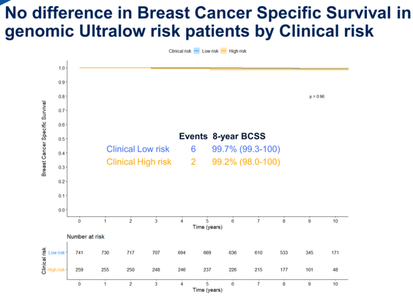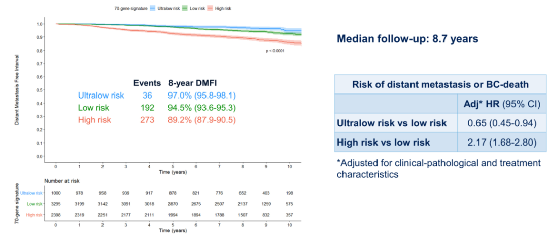 本次ASCO会议中公布了针对MINDACT研究当中1000例(15%)具有70-gene超低风险特征患者进行探索性分析结果。根据70-gene特征结果分层(high,low,ultralow)评估5年/8年无远处转移间期(DMFI)和BCSS,并对超低风险组通过临床风险进一步分层分析。