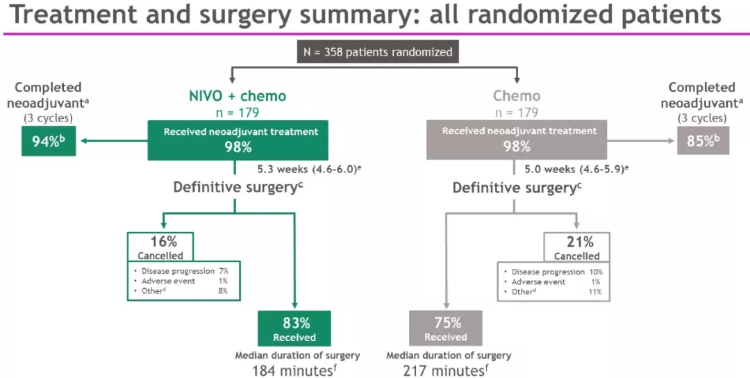 第二项研究是Spicer等人报告的III期CheckMate 816试验中新辅助免疫+化疗后的手术结局(摘要号8503)。IB期(≥4 cm)-IIIA期NSCLC患者在肿瘤切除前接受新辅助化疗+纳武利尤单抗或单独化疗。新辅助化疗+纳武利尤单抗组的病理完全缓解 (pCR)率令人印象深刻。我们可以从文献中了解,肺癌患者获得更高的pCR通常意味着更好的总体生存率。新辅助治疗加了PD-1抑制剂后,与单独化疗相比,不影响手术的可行性和时机。CheckMate 816研究表明,在新辅助治疗中,化疗和免疫检查点抑制剂联合治疗会明显增加获益。