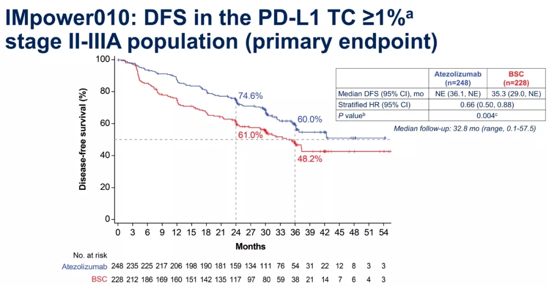第一项重要研究是Heather Wakelee等人报告的全球III期IMpower010临床试验。2021 ASCO发布了IB-IIIA非小细胞肺癌 (NSCLC)手术切除+辅助化疗后对比阿替利珠单抗(atezolizumab) vs最佳支持治疗的初步结果(摘要号8500)。研究纳入的所有患者PD-L1表达大于等于1%。与最佳支持治疗相比,术后辅助化疗后继续接受近1年阿替利珠单抗治疗是有益处的。这可能是一项改变临床实践的结果,我相信IMpower010研究的成果将继续发表、获FDA批准并纳入指南。这项结果是一个真正的进步。