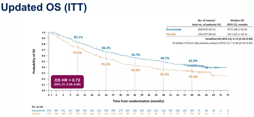 最后,Spigel等人报告了PACIFIC试验的5年随访结果:不可切除NSCLC同步放化疗后接受PD-L1抑制剂durvalumab(度伐利尤单抗)巩固治疗,患者的5年无进展生存率为33.1%,总生存率为42.9%(摘要号8511)。