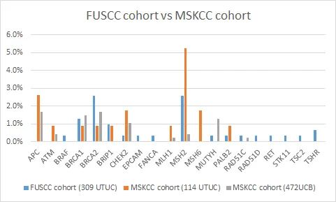 图1. 复旦肿瘤医院与纪念斯隆-凯特琳癌症中心UTUC患者胚系突变谱比较情况