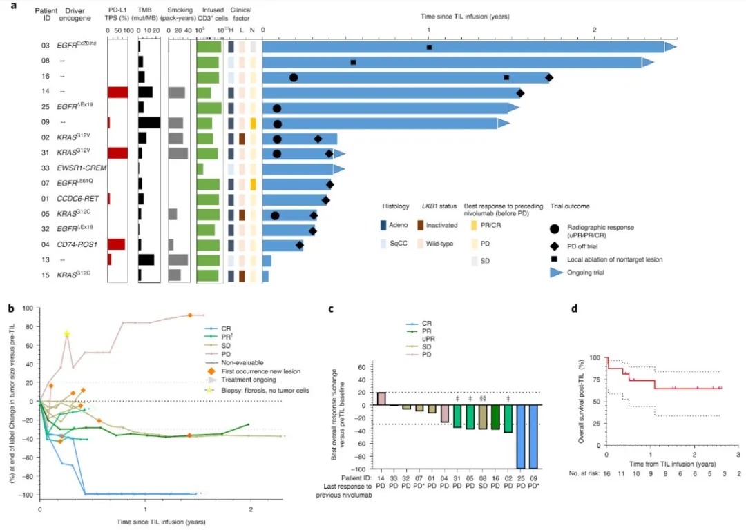 这项单臂、开放标签的I期试验入组20名患者,收集TIL,其中16名最终接受了TIL治疗。中位年龄为54岁;所有患者均患有转移性NSCLC,在纳武利尤单抗单药治疗后出现疾病进展。