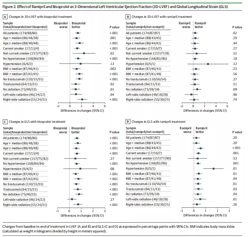 研究结果显示,12个月时,各组患者三维左室射血分数(3D-LVEF)变化情况:安慰剂组降低了4.4%,雷米普利组、比索洛尔组、雷米普利+比索洛尔组分别降低3.0%、1.9%和1.3%(P=0.01)。整体纵向应变变化情况:安慰剂组下降6.0%,雷米普利组、比索洛尔组分别下降了1.5%和0.6%,而在雷米普利+比索洛尔组上升了0.1%(P<0.001)。
