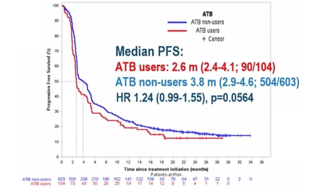 抗生素使用者中位PFS为2.6个月(95%CI:2.4~4.1;90/104),而非使用者则为3.8个月(95%CI:2.9~4.6;504 / 603)(HR 1.24,95%CI:0.99~1.55,P=0.0564)。