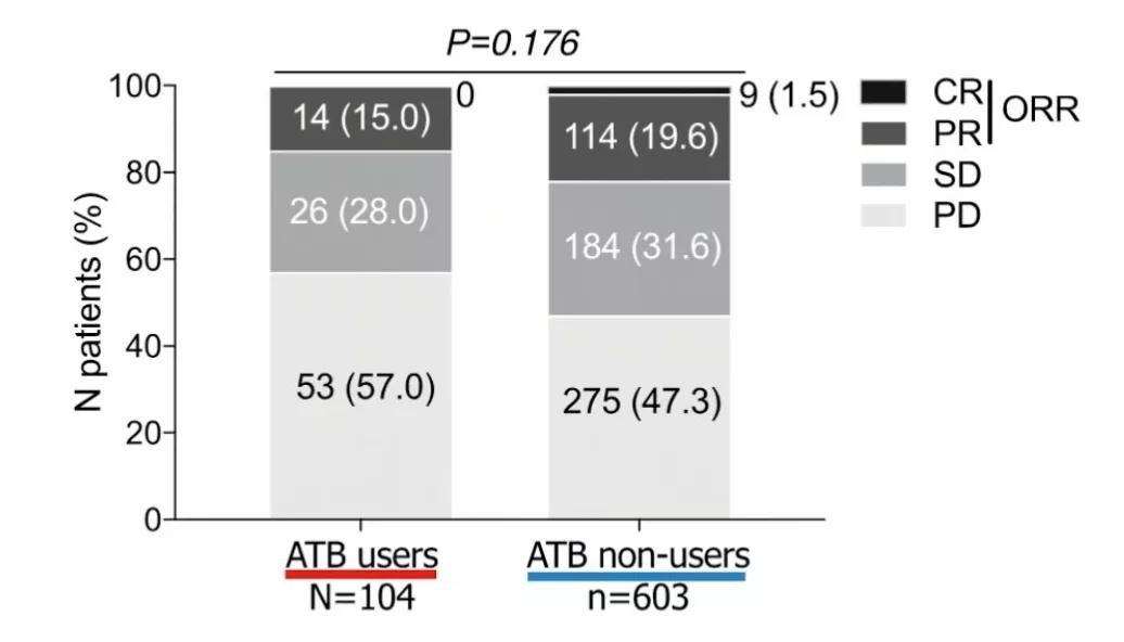抗生素使用者的ORR为15.1%,非使用者为21.1%(P= 0.176)。在抗生素使用者中,没有一例完全缓解(CR),且有53例(57.0%)发生进展性疾病(PD),而非使用者中分别有9例(1.5%)和275例(47.3%)为CR和PD。导致治疗停止的3-5级毒性反应发生率在抗生素使用者为26.9%,而非使用者为17.9%(P=0.031)。