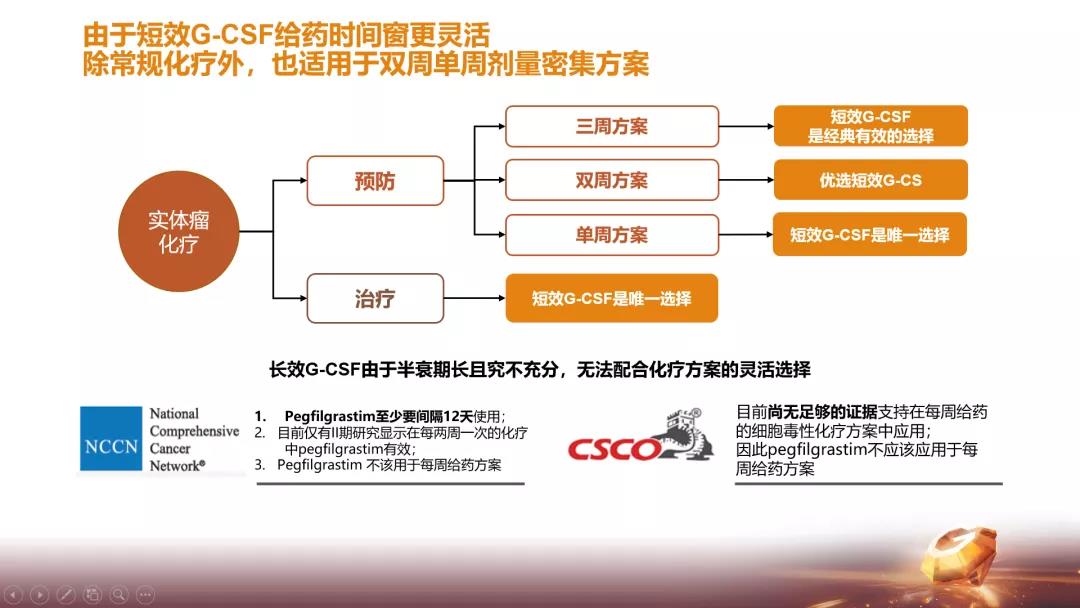在filgrastim之后,先后也涌现了其它类型的G-CSF,其中包括了长效类G-CSF。但值得指出的是,filgrastim作为一种短效G-CSF,较之于长效类G-CSF具有以下优势:①短效G-CSF效价更高,更为灵活方便,临床应用范围非常全面。②短效G-CSF更适合用于治疗性升白和每周化疗方案的预防性升白,因为长效G-CSF半衰期长且不充分,可能会造成剂量密集型的化疗患者造血功能受损,无法配合化疗方案的灵活选择。