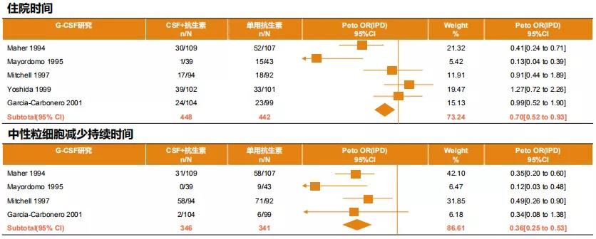 2005年J Clin Oncol杂志上的一项meta分析[5]纳入了13个RCT研究,对比了G-CSF加抗生素与单独使用抗生素治疗成人和儿童的FN,旨在评估G-CSF在FN治疗中的安全性和有效性。其结果表明,G-CSF治疗显著缩短住院时间和中性粒细胞减少持续时间(详见下图)。