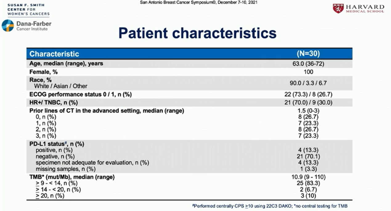 ■ 研究结果:2019年2月至2021年6月,来自3个不同学术机构的31例患者被纳入该研究。在30名开始研究治疗的患者中,中位年龄为63岁,21名激素受体阳性(HR+)乳腺癌,9名三阴性乳腺癌(TNBC),化疗中位线数为1.5(0-3)。在9例TNBC患者中,7例PD-L1状态已知(3例阳性,4例阴性)。中位TMB为10.9 Mut/Mb,16.7%(n=5)患者的TMB≥14 Mut/Mb。