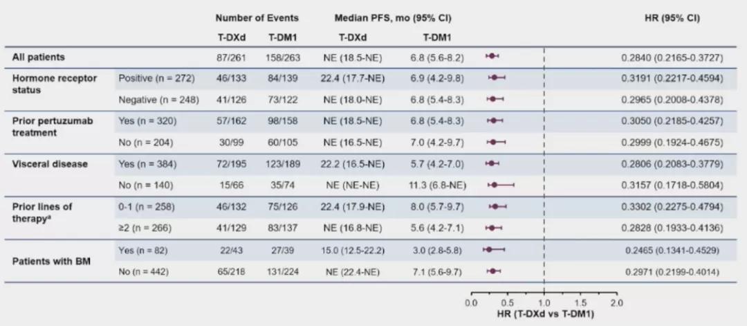 包括HR状态、是否内脏转移、既往治疗(0-1线或≥2线)在内的其他各亚组患者也观察到T-DXd组一致的PFS和ORR获益。