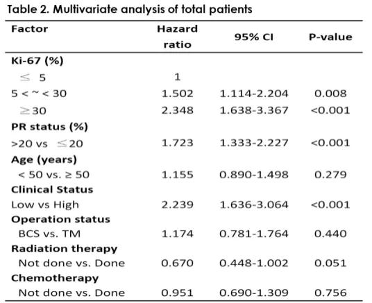 2021SABCS报道1项韩国回顾性研究(P2-08-13),纳入2759例在2008年-2016年期间接受手术的ER+/HER2-乳腺癌患者,分析Ki-67与DFS相关性(其中Ki-67≤5%,5%-30%和≥30%的患者占比分别为43%,45%和12%)。中位随访时间85个月,结果显示Ki-67与预后密切相关(图14),且多因素分析显示,除外Ki-67、PR状态和临床状态也是独立预后因素(图15),该研究还发现对于Ki-67 5%-30%人群Ki-67联合PR状态可作为重要的预后因素。