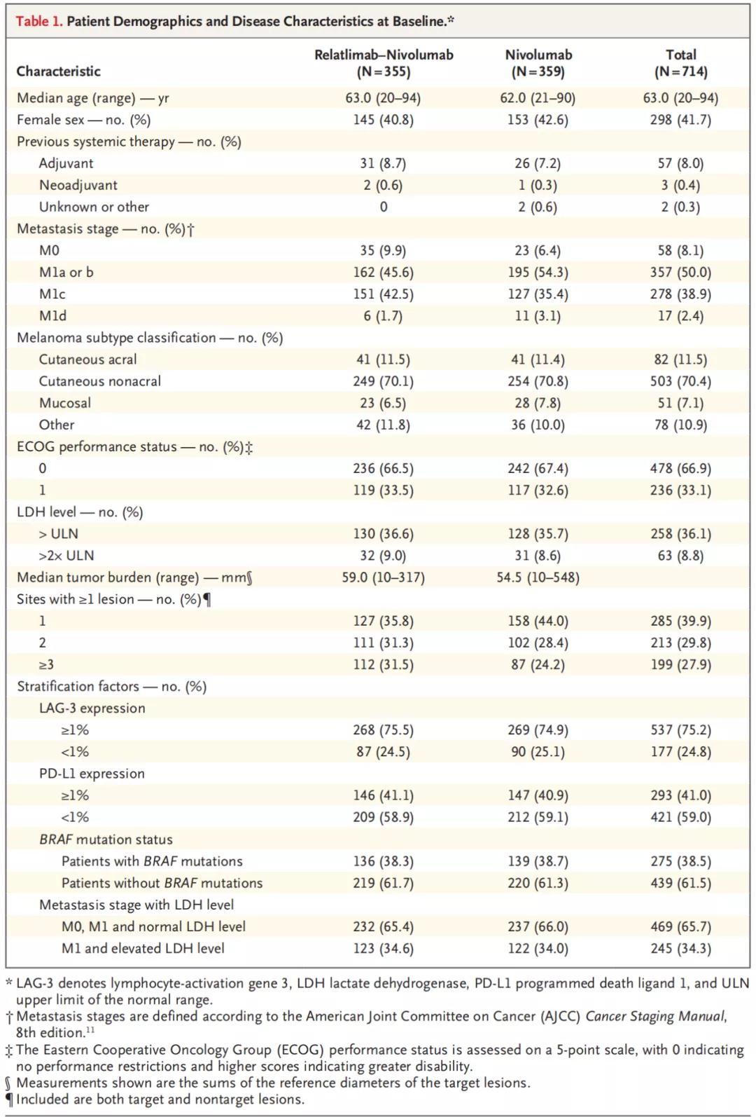 2018年5月至2020年12月,共有714名患者被随机分配在北美、中美洲、南美洲、欧洲、澳大利亚和新西兰的111个地点接受Relatlimab联合Nivolumab(n=355)或Nivolumab(n=359)单药治疗(表1)。与Nivolumab单药相比,Relatlimab联合Nivolumab组中M1a或M1b期疾病的患者更少,M1c期疾病的患者更多,有三个或更多部位至少有一个病变的患者比例更大。在两个治疗组中,共有60例患者(8.4%)曾接受过辅助或新辅助治疗,其中最常见的是干扰素(45例[6.3%])治疗,其次是CTLA-4抑制剂(7例[1.0%])和PD-1抑制剂(5例[0.7%])治疗(表1)。