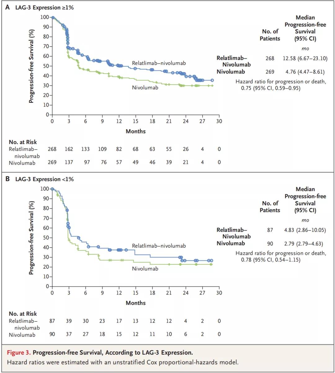 在两个治疗组LAG-3表达≥1%的患者中,患者中位PFS估计更长。无论LAG-3的表达情况如何,Relatlimab联合Nivolumab治疗组都比单药Nivolumab治疗获益明显(图3)。