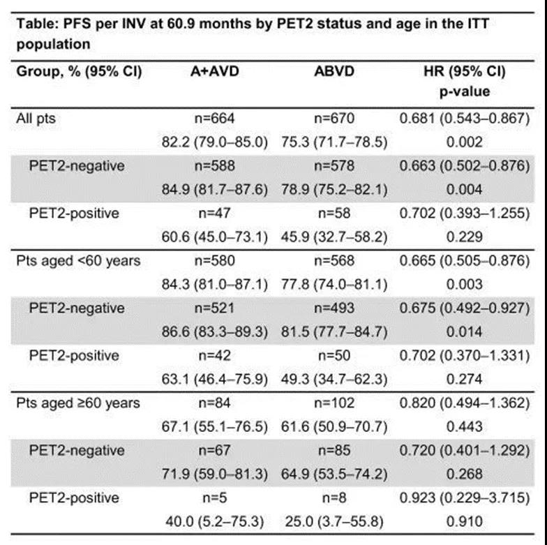 另外值得关注的是,2021年EHA会议上更新了ECHELON-1研究长达5年的随访数据,该研究对比了BV联合AVD(多柔比星/长春花碱/达卡巴嗪,即A+AVD)方案与ABVD方案在初治、III/IV期cHL患者中的疗效差异,中位随访60.9个月后结果显示:相较之于ABVD方案而言,BV+AVD组患者的PFS获益更具优势,5年PFS分别为82.2%vs 75.3%(HR=0.681,p=0.002),详见下表。该研究表明,A+AVD方案对于所有先前未经治疗的III期或IV cHL患者都是有吸引力的治疗选择,可进一步提升cHL患者的PFS,且无需通过临时PET2状态适应治疗,避免了博来霉素暴露,同样可作为推荐的治疗方案。