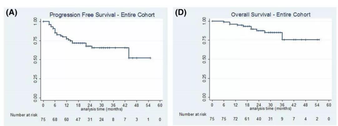 另外,Hematological Oncology期刊上的一项多中心回顾性研究中,对75例ASCT后接受BV巩固治疗的R/R-cHL患者进行了分析,中位随访26个月后结果显示:①50例(67%)患者仍有治疗反应,其中41例(54.6%)仍为完全缓解(CR),6例(8%)为部分缓解(PR)。②在生存方面,2年PFS和OS率分别达67.75%和87.6%(详见下图),显示出不俗疗效。