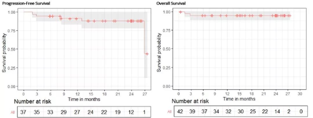 同样在2021ASH会议上,一项单臂、II期、多机构临床试验(abstract 229)评估了在符合ASCT条件的复发/难治经典型霍奇金淋巴瘤(R/R-cHL)患者中应用pembrolizumab联合ICE方案(PEM-ICE)的疗效。该研究共入组43例R/R-cHL患者,结果显示:①两个周期的PEM-ICE治疗后,通过PET/CT成像评估CMR率为86.5%,这相比于历史结果改善70%。②经过27个月的中位随访发现2年PFS率为88.2%;OS率为95.1%(详见下图)。