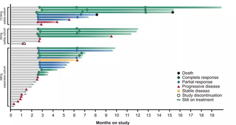 GO40554研究探索了Mosunetuzumab(CD20/CD3双特异性抗体)在老年体弱、不适合R-CHOP方案标准治疗的初治DLBCL患者中的疗效及安全性。共入组48例ECOG评分≤2分的DLBCL患者,在接受Mosunetuzumab中位治疗7个周期后结果显示:①可评估疗效的患者中的ORR为61.5%;CR率为43.6%;17例CR患者中有8例随访时间≥12个月并维持CR(见下图)。②72.9%的患者出现≥1次治疗相关不良事件,最常见的是细胞因子释放综合征(29.2%)、疲劳(18.8%)和腹痛(14.6%)。