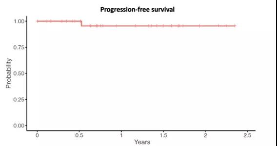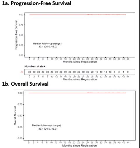 在2021年ASH上公布的另一项研究(abstract 231)中,同样入组了30例初治cHL患者并接受PD-1单抗帕博利珠单抗序贯AVD方案治疗,中位随访33.1个月后结果显示:所有患者均存活并且无任何患者复发,这意味着在长达33.1个月中cHL患者的PFS及OS为100%(见下图),同时发现PD-L1表达水平与帕博利珠单抗疗效未见明显相关性。