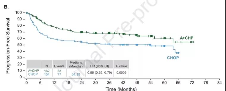 在ECHOLON-2研究长达5年的随访中,维布妥昔单抗联合CHP(A+CHP)能进一步改善外周T细胞淋巴瘤的生存,结果显示,A+CHP组患者的PFS为62.3个月,显著优于CHOP组的23.8个月(HR=0.70,p=0.0077);另外A+CHP组患者的5年PFS率为51.4%,同样优于CHOP组的43%(详见下图)。目前针对B细胞淋巴瘤的ADC药物也显示出了较好的疗效和可控的安全性。