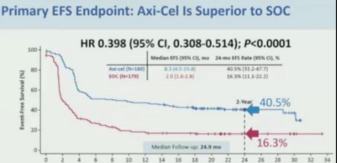 同样在2021年ASH大会上,ZUMA-7研究Ⅲ期结果得以更新,该研究共纳入359例患者,1:1随机分配至axi-cel组或标准治疗(SOC)组进行治疗,旨在评价CAR-T与标准治疗在二线复发/难治性DLBCL患者中的疗效.中位随访24.9个月后结果显示:①axi-cel组的客观缓解率(ORR)显著高于SOC组,分别为83%vs 50%(OR=5.31,95%CI:3.1–8.9;P<.0001),完全缓解率(CR)则分别为65%vs 32%②axi-cel组的中位EFS明显要优于SOC组,分别为8.3个月vs 2个月;2年EFS则分别为41%(axi-cel组)vs 16%(SOC组),见下图;在总体生存(OS)方面,axi-cel组患者的中位OS尚未达到(NR),SOC组中位OS为35.1个月(HR:0.730;P=.027),axi-cel组更佳(见下图)