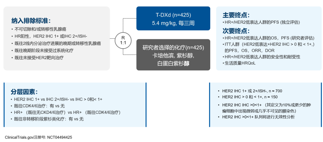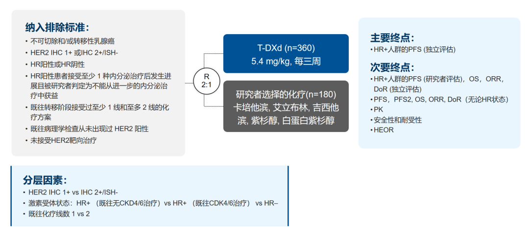 DESTINY-Breast04是一项全球、开放标签、关键Ⅲ期研究,旨在评价T-DXd对比研究者选择的化疗,用于治疗HER2低表达晚期乳腺癌患者的疗效和安全性。入组患者为HER2低表达(IHC 1+或IHC 2+且ISH-)的不可切除和/或转移性乳腺癌,患者包括HR阳性(n=480)或HR阴性(n=60),既往接受过1线或2线化疗。按照2:1的比例随机分配至T-DXd组(5.4 mg/kg)和化疗组(卡培他滨、艾立布林、吉西他滨、紫杉醇或白紫),主要终点是BICR评估HR+人群的PFS;次要终点包括所有人群(无论HR状态)的BICR评估的PFS,以及HR+阳性人群和所有人群的OS等[1]