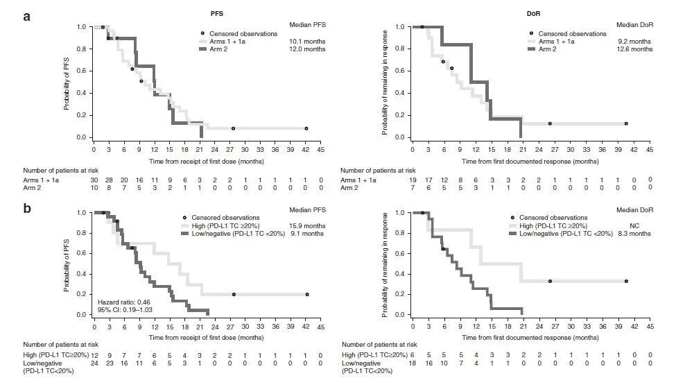 从2014年8月至2015年9月,分别有23例和11例患者纳入队列A(度伐利尤单抗3 mg/kg:10人,10 mg/kg:13人)和队列B。两个队列中,度伐利尤单抗中位治疗周期数分别为8周期和5周期,在队列A中,疾病进展是导致治疗终止的最常见原因,而在队列B中,不良反应是导致治疗终止的最常见原因。