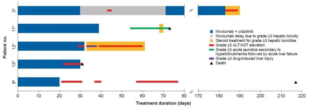 另外,克唑替尼与另外一款明星药物——Pembrolizumab的联合同样不尽如人意。2019年,来自亚拉巴马州的学者在The Oncologist杂志发表了克唑替尼联合Pembrolizumab在ALK阳性晚期NSCLC患者中的疗效及安全性研究,这项研究仅仅纳入9例患者,竟有4例患者出现剂量限制性毒性,且毒性同样主要聚焦在肝脏。多数剂量限制性毒性表现为严重的转氨酶升高,部分患者还可以出现严重乏力。基于安全性考虑及患者入组速度较慢,最终,研究被提前终止。