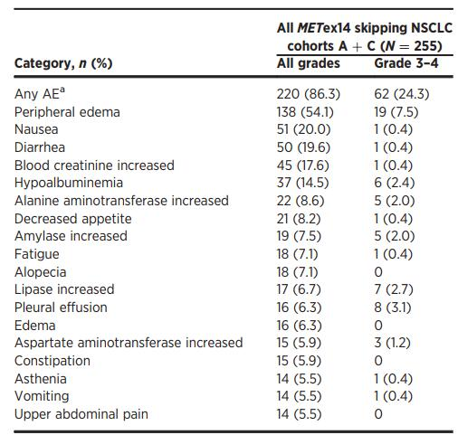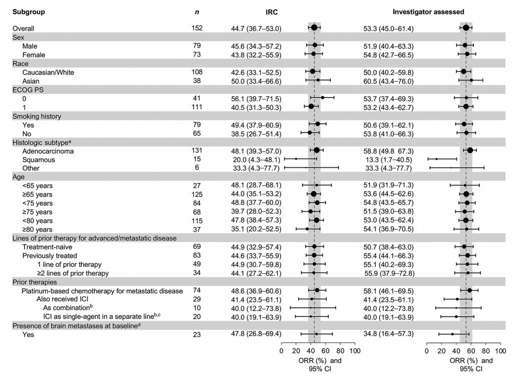 至2020年7月,队列A共纳入152例患者,中位随访时间16.4个月,18.4%的患者在数据分析时仍然接受治疗,中位年龄73.1岁,分别有52%、52%的患者为男性及吸烟患者。队列A和队列C共纳入255例患者组成安全性分析人群。数据分析时,独立评审委员会评估的全组患者ORR为44.7%,中位DOR为11. 1个月,中位PFS为8.9个月;研究者评估的ORR为53.3%,中位DOR为12.5个月,基于组织及外周血检测入组的患者,接受治疗后ORR及PFS相似;50%的患者出现死亡事件的情况下,中位OS为17.6个月。基于年龄分析发现。<75岁和>75岁的患者,ORR分别为48.8%和39.7%。>80岁的患者,ORR和DCR分别为35.1%和67.6%。中位DOR和PFS分别为10.1个月和8.6个月。