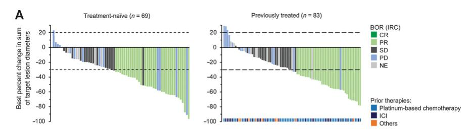 治疗线数并未对患者疗效造成显著影响。初治和经治患者的ORR分别为44.9%和44.6%,中位DOR分别为10.8个月和11.1个月,中位PFS分别为8.5个月和10.9个月;既往治疗药物同样未对患者疗效造成显著影响。既往经过铂类药物治疗的患者,中位DOR为12.4个月,中位PFS为11.0个月,而既往接受过免疫检查点抑制剂治疗的患者,中位DOR为9.5个月,中位PFS为10.9个月。23例患者基线时有脑转移,其中17例患者既往接受过放疗,这部分患者ORR为47.8%,中位DOR和中位PFS均为9.5个月。152例患者中,6例患者出现新发脑病灶,其中,有4例患者基线存在脑转移。
