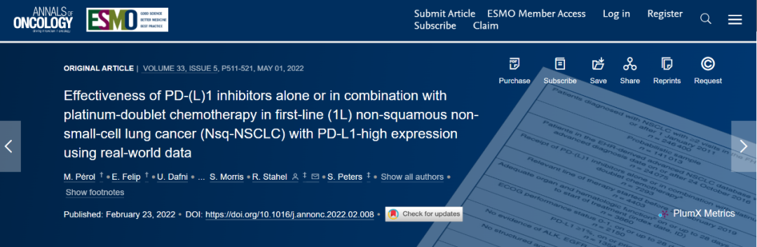 研究方法:这是一项回顾性、观察性队列研究,基于美国健康电子数据系统进行。该系统覆盖了全美280家癌症诊疗数据。相关信息研究,以ICD-9或ICD-10为编码进行信息提取,所有患者至少有两次诊疗信息,年龄≥18周岁,PS评分0~1分,分期为IV期或经过疾病进展后诊断为IV期,PD-L1≥1%,最短随访时时间超过12个月。携带驱动基因突变、PS评分缺失、疾病未出现进展或末次随访数据缺失的患者不予入组。该主要研究终点为OS,次要研究终点为真实世界中的PFS。