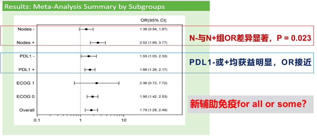 研究结果:与单纯新辅助化疗相比,新辅助免疫治疗显著改善TNBC患者的pCR率(OR=1.79,95%CI=1.28~2.49,P<0.001)。亚组分析显示:淋巴结阴性和阳性从新辅助免疫治疗获益具有显著性影响(组间P=0.023);此外,在化疗的基础上联合免疫新辅助可显著提高PD-L1阳性和阴性患者的pCR率,OR值分别为1.66(P<0.001)和1.55(P=0.034)。