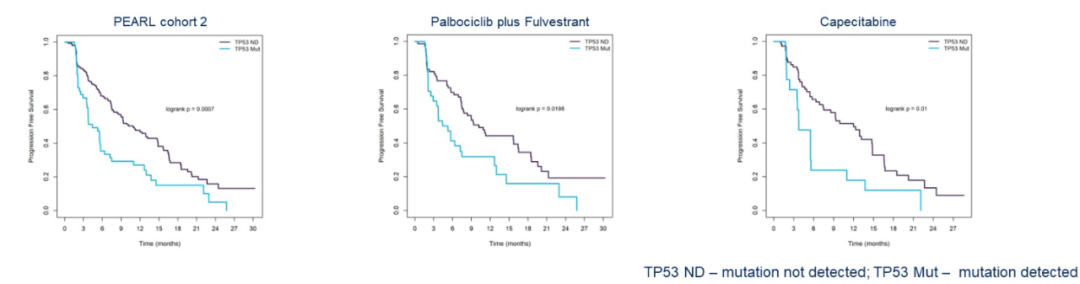 令人遗憾的是,2019年SABCS大会上公布的其主要PFS和OS结局均为阴性。然而,PEARL研究并未止步,今年ASCO会议汇报了队列2患者的基线期基因表达情况、治疗过程中血浆ctDNA动态变化与PFS之间的相关性研究,结果显示:①基线TP53突变与预后差相关,并且这种相关性与选择CDK4/6i联合治疗还是化疗无关,这与Kim等人[1]的研究结果一致。TP53作为一个经典抑癌基因,其突变体通过上调PI3K/AKT/mTOR等信号通路,下调肿瘤抑制蛋白,从而刺激肿瘤细胞增殖。最近的临床前研究表明,一些化合物(prima-1和prima-1Met)能选择性地靶向p53突变蛋白并恢复其在乳腺癌细胞中的野生性,从而逆转恶性肿瘤细胞。我们期待更多着眼于TP53突变的临床研究为这一人群带来新的希望。