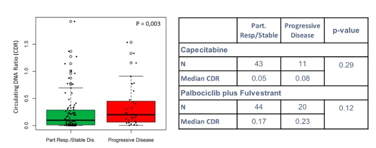 ctDNA的抑制程度可能与客观缓解相关(客观缓解者的中位CDR为0.1,疾病进展的中位CDR为0.2,P=0.03),当按治疗分层时无显著统计学意义。