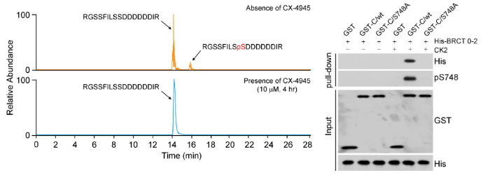 2、接下来我们想探究是什么激酶促进了HTATSF1 S748的磷酸化,通过序列比对发现ECT motif符合CK2磷酸化的Ser/Thr-X-X-Asp/Glu基序,体外磷酸化实验证明CK2能够促进S748的磷酸化,而其抑制剂CX-4945有效抑制了该效果(图3)。