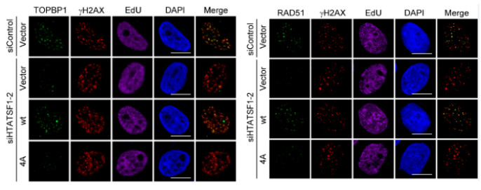 3、为了探究HTATSF1是否会影响TOPBP1在DSB处的募集,我们通过敲低HTATSF1发现S期TOPBP1在损伤位点的积累减少,同时发现HTATSF1是通过S748位点调控TOPBP1的积累(图4)。