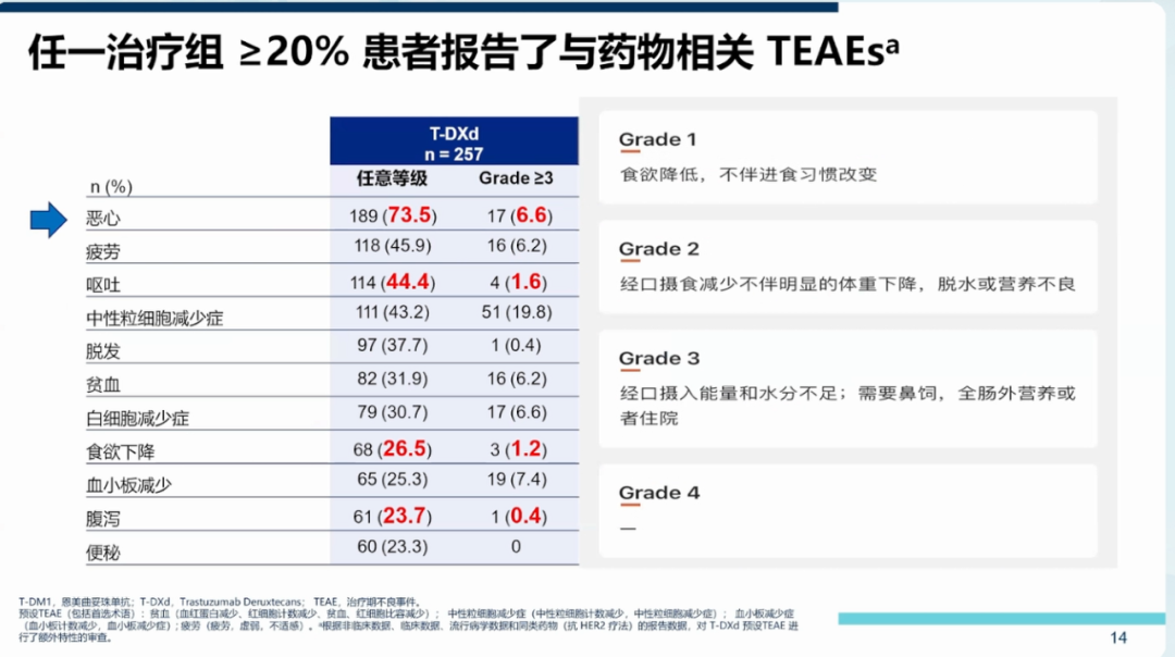 T-DXd第一轮出现的AE通常是消化道反应,治疗第一周患者往往会有恶心、呕吐、食欲不振等,在治疗90天之内出现恶心呕吐的风险较高,但基本上都是1~2级的AE。今年更新的NCCN指南将T-DXd列为中等致吐药物,且顺铂和蒽环类药物同样是中等致吐药物。有一项小样本的回顾性研究发现,按照化疗的止吐方法来进行预防干预对T-DXd来说也是很有效的。