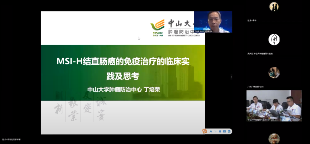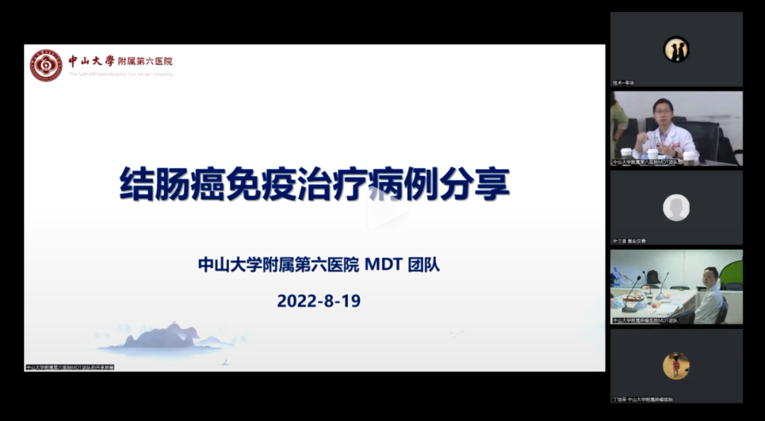 中山大学第六医院MDT团队成员放射诊断科曹务腾教授、放疗科陈海洋教授、结直肠外科黄俊教授、肝胆外科李国林教授、病理科王超教授、肿瘤内科张剑威教授在黄美近教授的带领下,对该病例的整个治疗过程展开分析,内容涵盖了林奇综合征、原发灶及转移灶的时空异质性、不同肿瘤部位是否均需分子检测、免疫治疗与化疗引起的肿瘤退缩的异同、结直肠癌肝转移、粘液腺癌免疫治疗疗效影像评估、放疗对免疫治疗增敏作用、免疫联合用药策略等方面。
