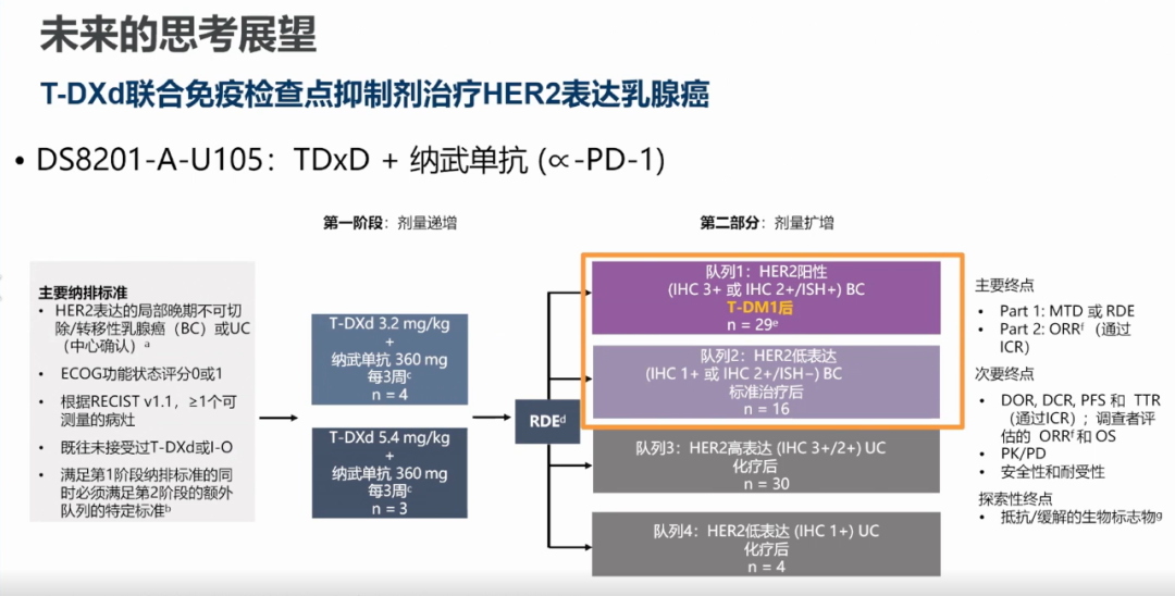 较早前,NSABP B-31、NCCTG N9831研究对HER2阳性的再判读,使HER2阳性低表达人群走进临床视线,但在随后的大分子单抗、小分子TKI等一系列抗HER2治疗临床研究中,并没有看到针对HER2低表达人群的治疗获益。目前,HER2低表达乳腺癌的治疗被归入HR+/HER2-或三阴性乳腺癌(TNBC),而后二者经过CDK4/6i或化疗失败后的PFS均不足半年,仍有巨大未被满足的临床需求。